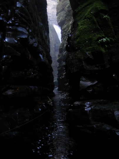 But before dinner time we had an afternoon excursion. Michael had to stay behind to sleep off his hang over. He missed a hike in the surroundings of the village to a hidden waterfall. The guide, the Americans and I walked along a river for quite a while until we came to a spot where we had to step into the water. There we held on to a cable to enter a canyon.