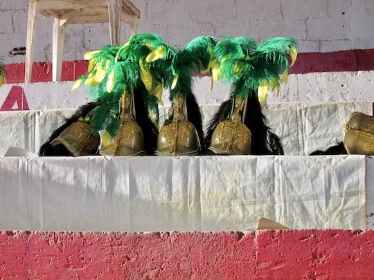 Friday afternoon we went to the samba school of Vila Vilha to get our costumes for the carnival parade. It was a bustling place. Locals ran around, knitted, cut pieces of cloths, glued beautiful decoration on helmets. Everywhere you saw different parts of a large variety of costumes. For us it was impossible to find out how it would all fit together.