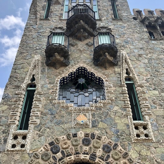 The exterior façade showcases a Neo-Gothic style, reflecting Gaudí’s homage to the medieval castle that once stood on the site. Torre Bellesguard’s tower features Gaudí’s signature four-armed cross, adorned with red and yellow mosaics that mirror the Catalan flag. At its base, a crown encircles the structure, symbolizing the site’s historical connection to the Crown of Aragon.