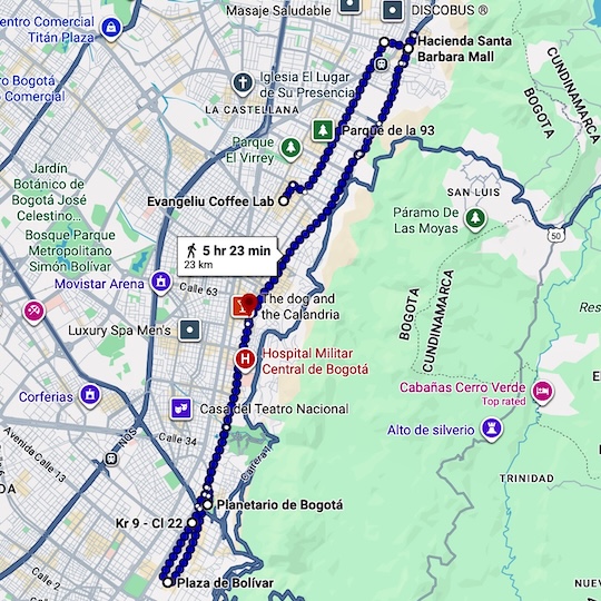 I had heard about the architectural highlight of the Virgilio Barco Public Library situated in one of the parks of Bogotá. After some research I noticed several parks that are connected to each other when leaving Chapinero towards the airport. So we felt it was a good opportunity for a long walk in a more quiet surrounding.