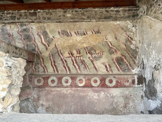 Fascinating to see was the mural of a puma. And then – half way down the avenue – we encountered the next highlight: The Pyramid of the Sun is one the largest pyramids on the planet (measured in volume). It is 75 meters high and each side measures 230 meters. It was built on a carefully selected spot in the shadow of the mountain Cerro Gordo. I will explain below why this is important. Currently, you cannot climb up the pyramid, thus we took some photos and continued to the Northern end of this ancient city.